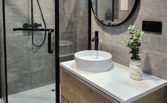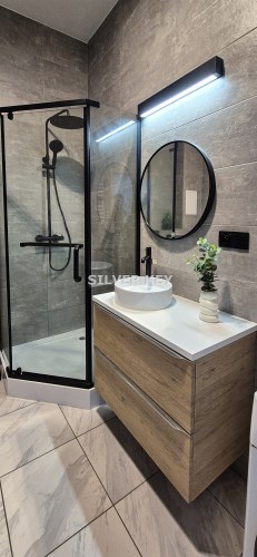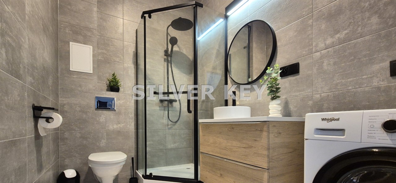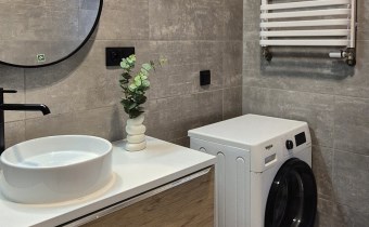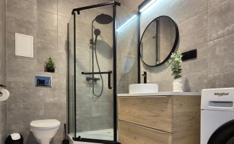- Łazienka: Prysznic, szafka z umywalką, misa WC, pralka, lustro.